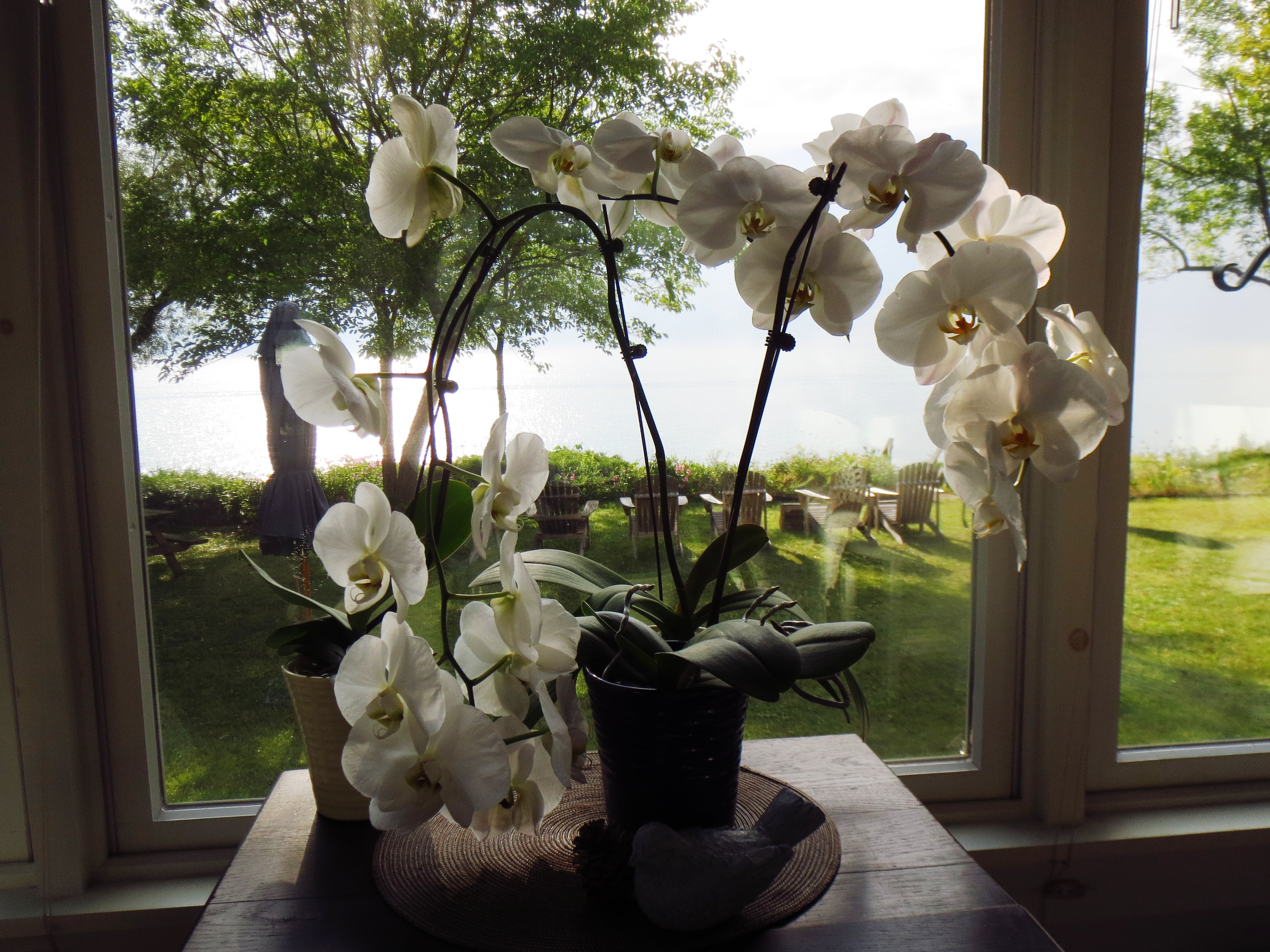 My favorite is the white “phalaenopsis”.  Many believe they are a needy complex species.  I believe they are a hardy independent genus. They ask for little…give so much. Beautiful blooms visit a minimum of 3 months.  After their visit the stem is cut just above one of the stem nodules and  patience waits.  They require little attention.  The long erect roots that shoot from the base  capture from the sky the majority of moisture required for survival.   Six months may pass before their return. Gradually… a new stem will shoot either from the stem nodule or the base of the plant.