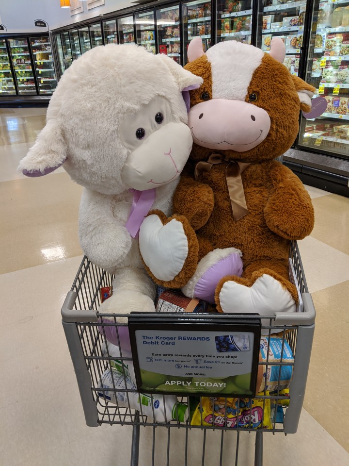 I could only fit two in my cart…thank goodness. The cuteness was overwhelming. So I buckled in my two new friends…. on top of the milk, the chicken, the 2 gallons of ice cream and all of the other non-essential treasures that I believed I needed. Rather than going directly to the check out I decided to give Baby Sheep and Mini Moo Moo a tour of the grocery store. As we carted around from lane to lane I could see the little smiles and giggles that my new friends brought to the stressed vacant faces we passed. I saw eyes light up if even for a moment. It hit me….we were making someone’s day just a little bit brighter. We toured the entire store.